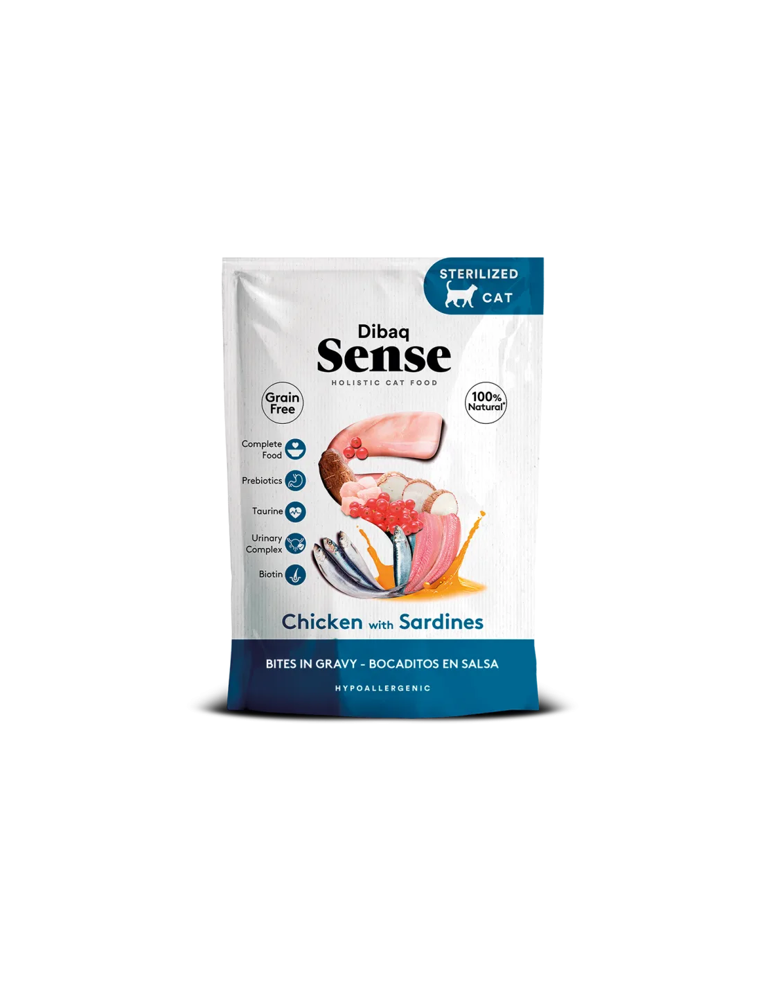 Alimento hipoalergénico completo para gatos adultos esterilizados. Deliciosas mordidas em molho de frango com sardinha, prebióticos, biotina, taurina e complexo urinário. Receita sem cereais.