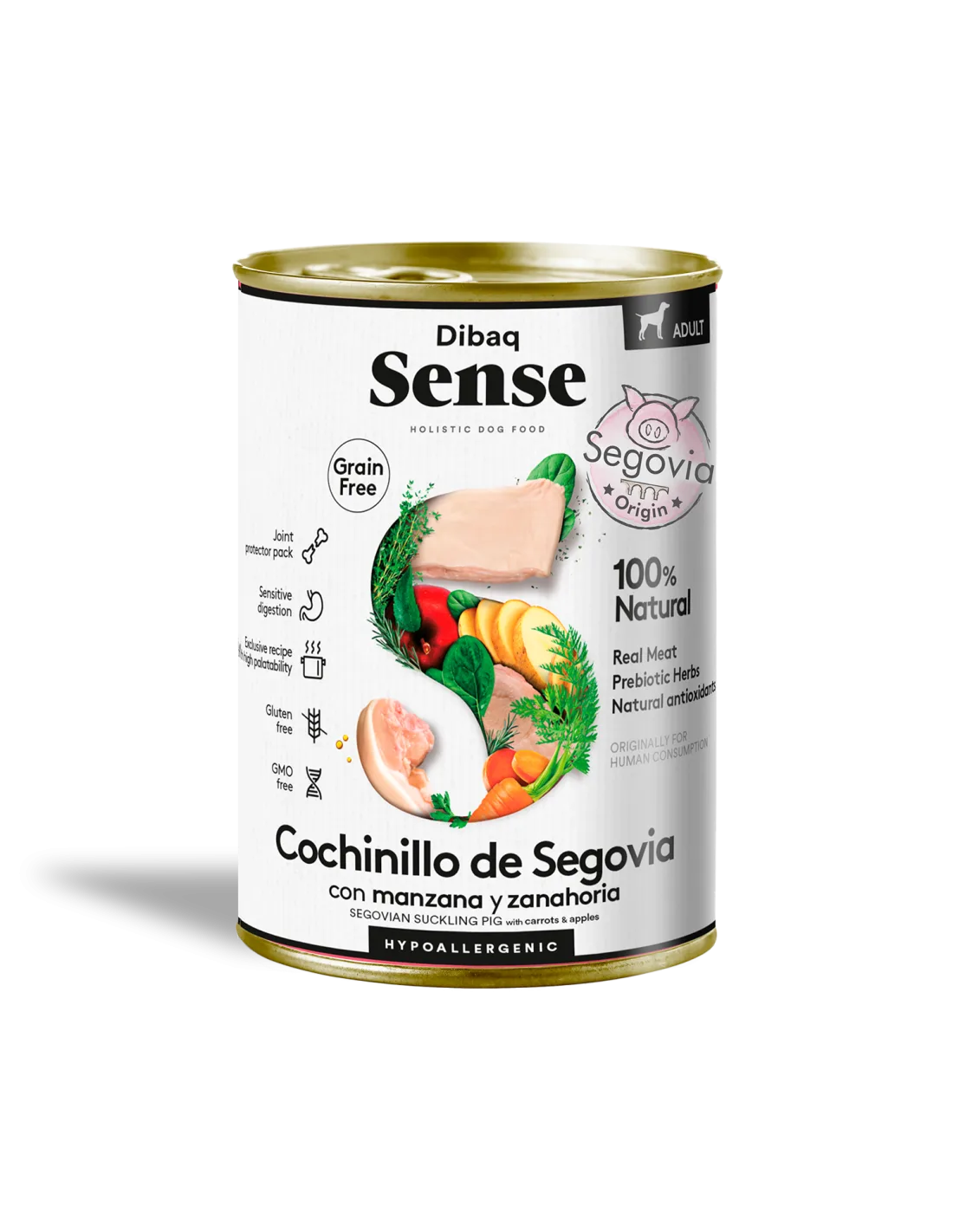 OMPOSIÇÃO: Leitão de Segóvia 76%*, batata, frutas frescas e legumes 2% (cenouras* e maçã*), óleo de salmão 1% (fonte de ácidos gordos ómega 3 e 6), pack protetor articular 0,5% (sulfato de condroitina, cloridrato de glucosamina e MSM), substâncias minerais, plantas aromáticas com propriedades antioxidantes naturais 0,02% (alecrim*, tomilho * e orégão*). * Ingredientes naturais.