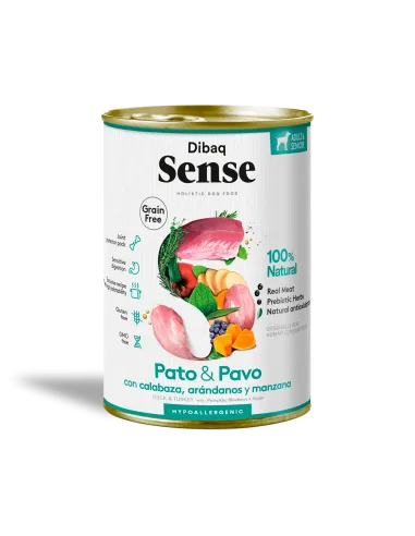 Carne fresca 80% (pato 40%* e peru 40%*), batatas, legumes frescos e frutas 3% (abóbora*, mirtilos* e maçã*), óleo de salmão 1% (fonte de ácidos gordos ómega 3 e 6), pacote protetor articular 0,5% (sulfato de condroitina, cloridrato de glucosamina e MSM), substâncias minerais, plantas aromáticas com propriedades antioxidantes naturais 0,02% (alecrim*, tomilho* e orégano*). * Ingredientes naturais.