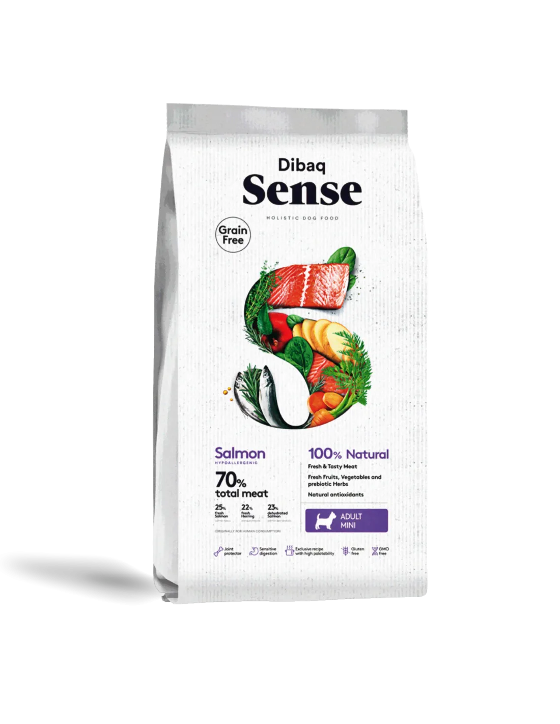 Alimento hipoalergénico 100% natural para cães adultos de raças mini elaborado com salmão fresco que auxilia o sistema imunológico e melhora a pelagem