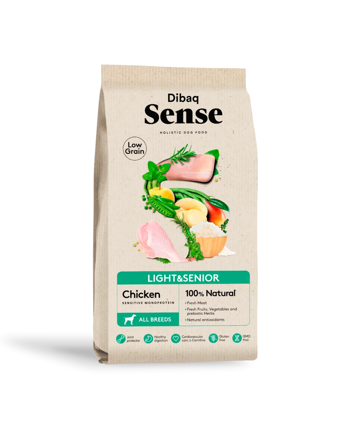 Frango 38% (frango fresco 20%*, frango desidratado 18%), arroz 20%*, amido de ervilha, polpa de beterraba, óleo de frango, ervilhas descascadas*, fécula de batata, proteína de frango hidrolisada, fígado de frango hidrolisado, substâncias minerais, fibra vegetal 2%, legumes e frutas frescas 4% (feijão verde*, batata*, manga* e maçã*), protetores articulares (sulfato de condrotina, sulfato de glucosamina e MSM (componentes da cartilagem articular)), mandioca, raiz de chicória (fonte de inulina). -FOS), levedura (MOS), extratos vegetais (orégano, alecrim, tomilho, matricária e alcachofra), mirtilos, L-carnitina e antioxidantes naturais (tocoferóis*).* Ingredientes naturais.