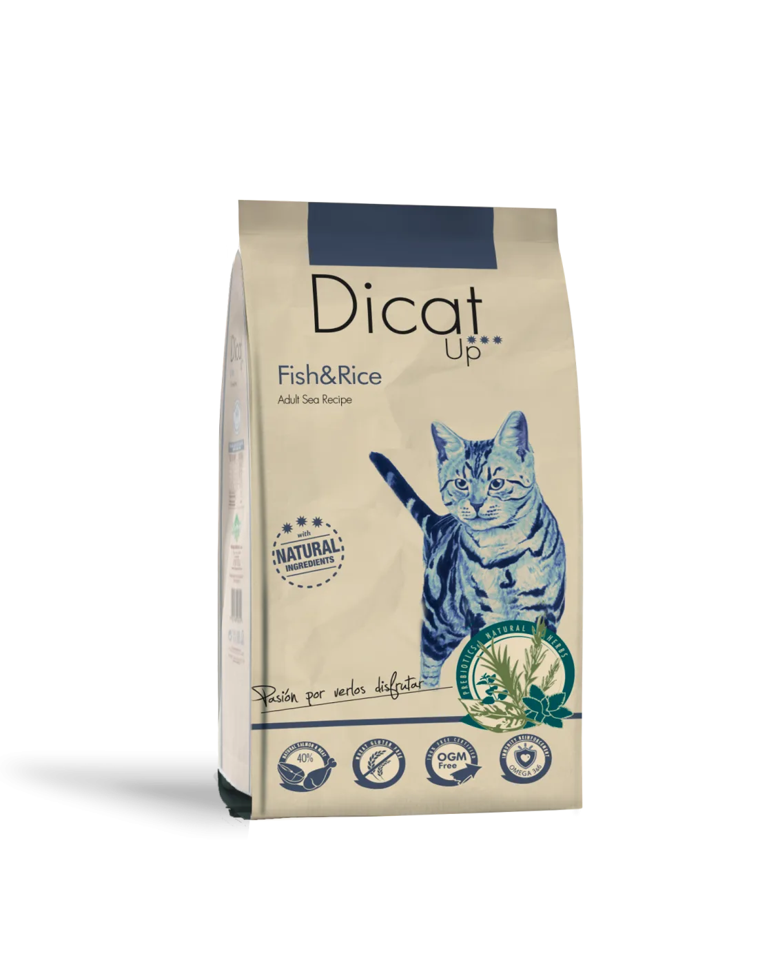 Alimento completo de peixe e arroz para gatos adultos de todas as raças. Receita feita com plantas naturais, L-Carnitina e protetores articulares.