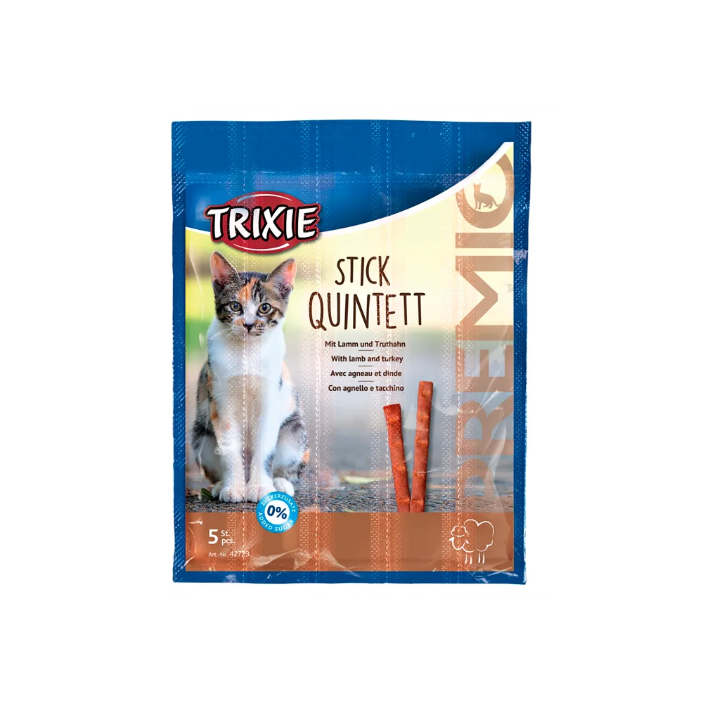 Os snacks da Trixie Premio Stick Quintett com Cordeiro e Peru são ideais para dar ao animal entre as refeições. A forma em stick é bastante prática, podendo partir-se e ser dado ao seu animal em pedaços. Possuem um alto teor de carne (95%), a qual é uma fonte de proteínas de grande qualidade e contém taurina que é um aminoácido essencial para a ajuda do músculo cardíaco, sistema digestivo, visão e reprodução nos gatos. Estes snacks não contêm glúten, pelo que ajudam a reduzir as sensibilidades alimentares do animal. A receita sem açúcares adicionados, para além de ser benéfica para a saúde do gato, ajuda a controlar o seu peso.